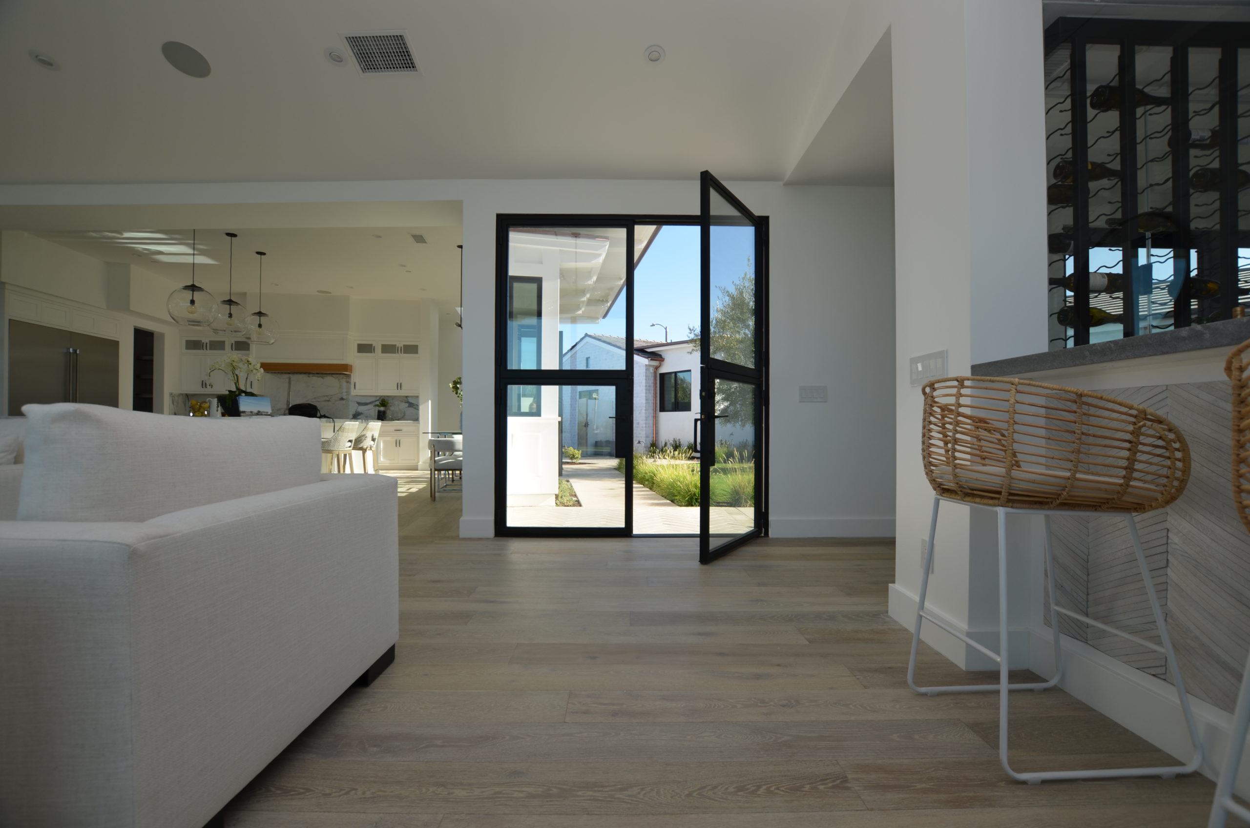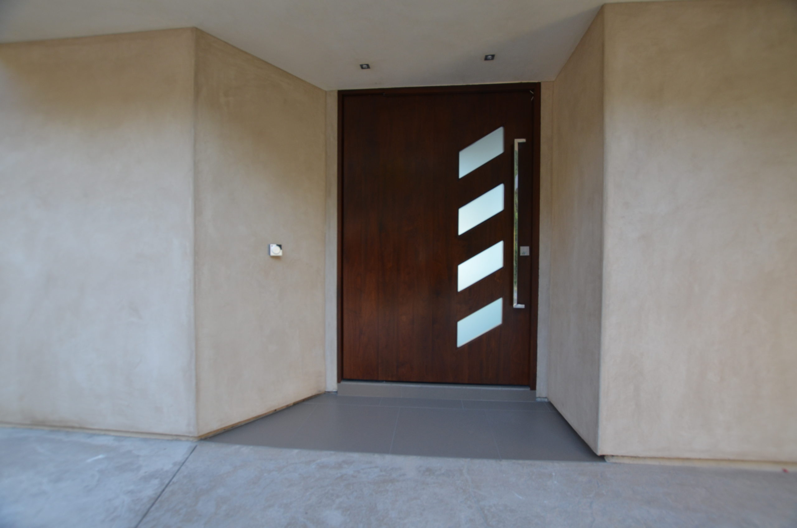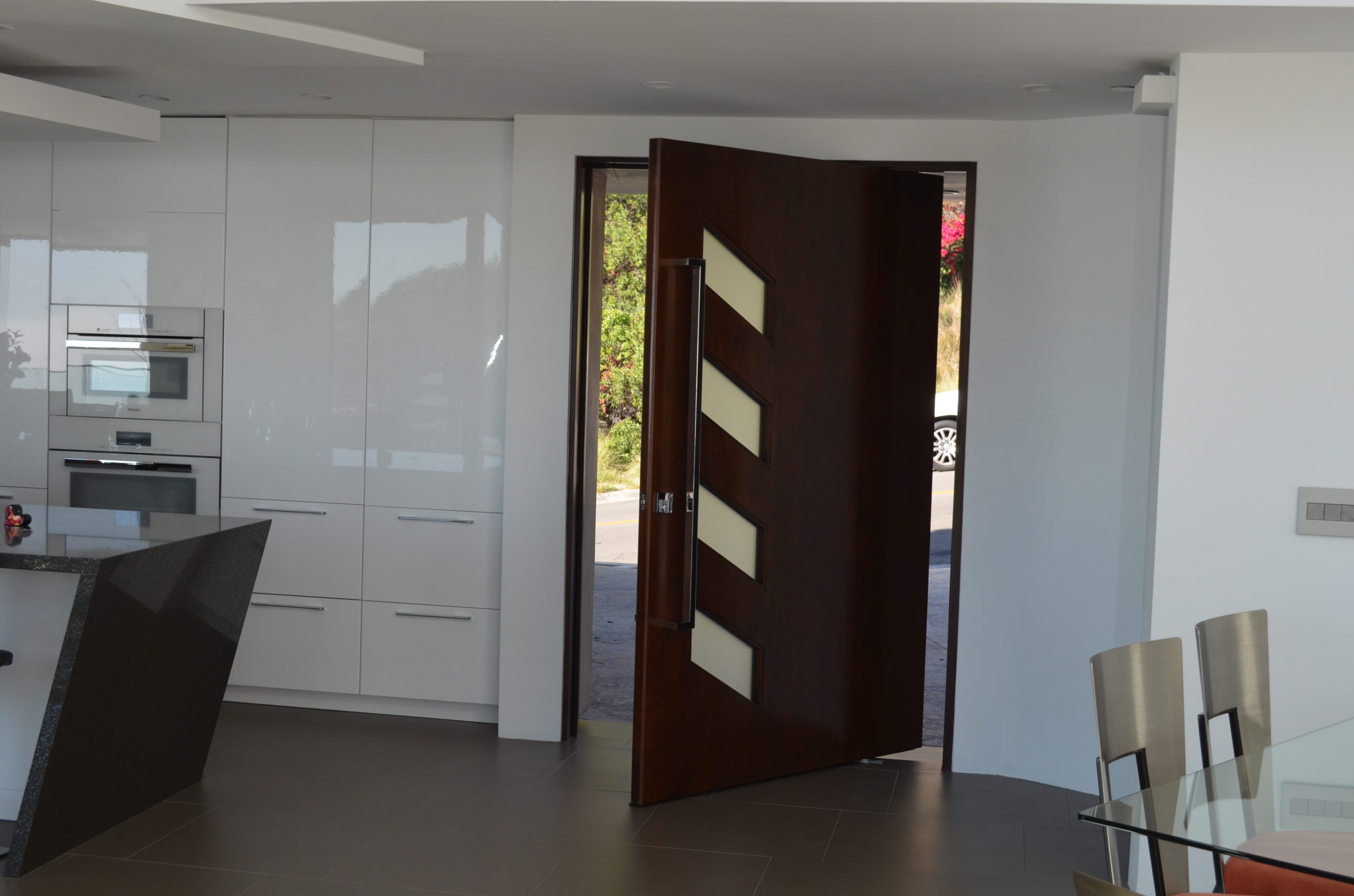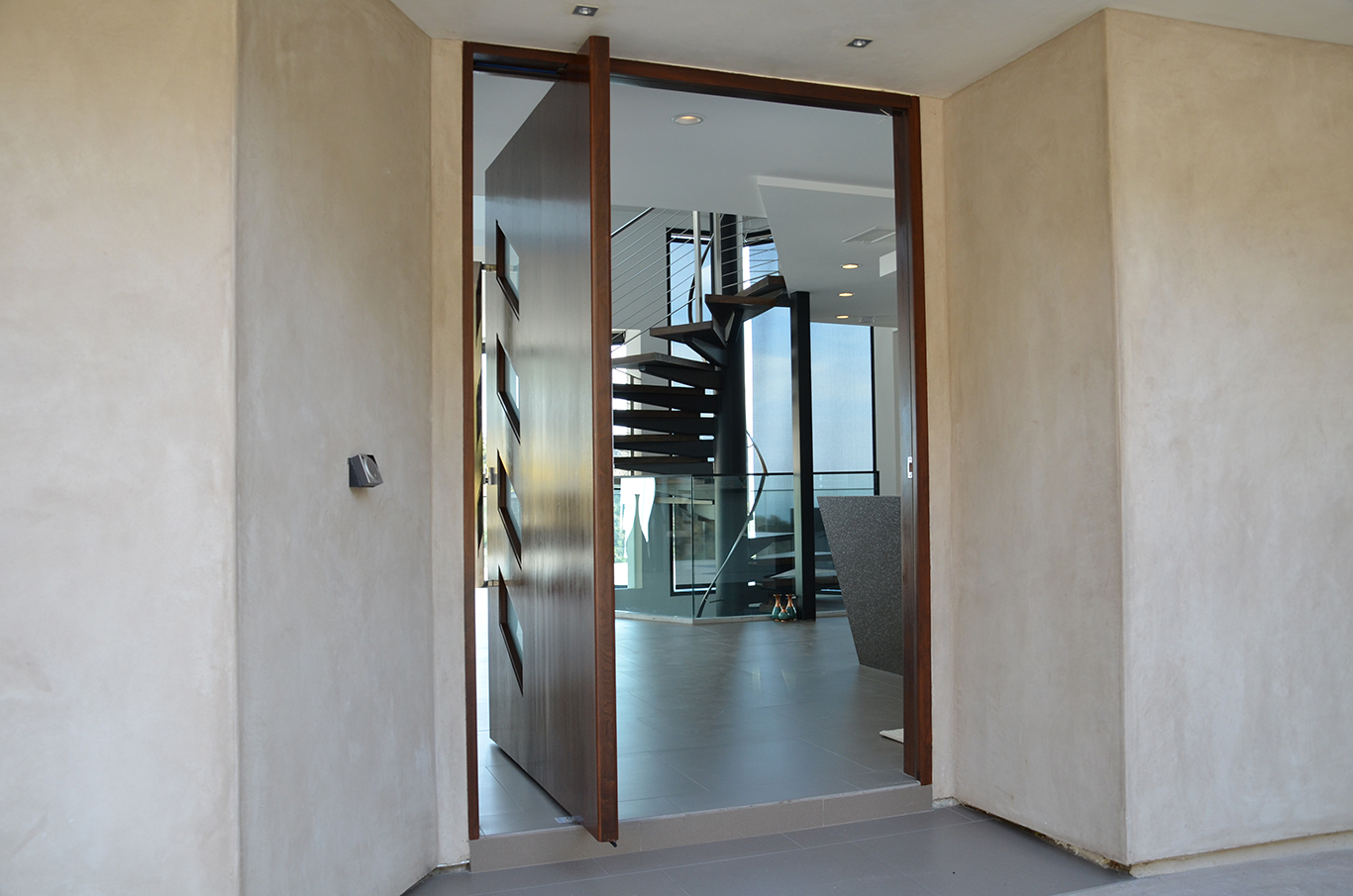 Flush Pivot Door with Integrated Steel Pull Handle and Sidelite.