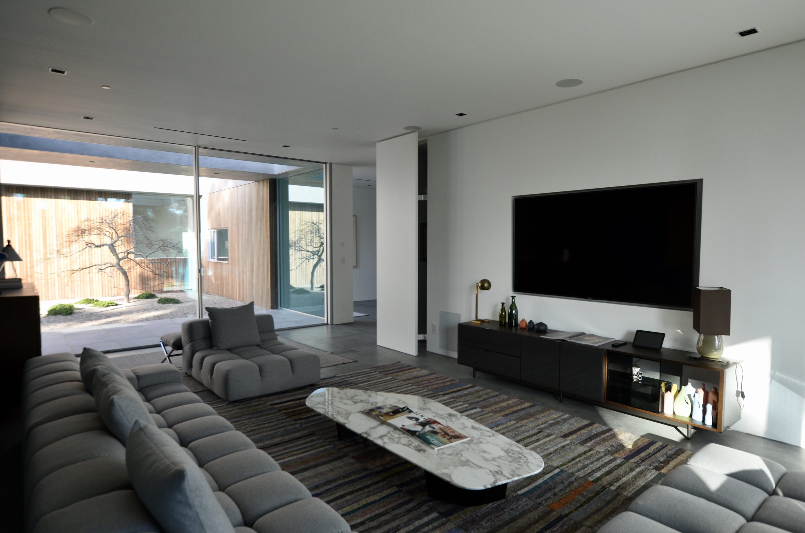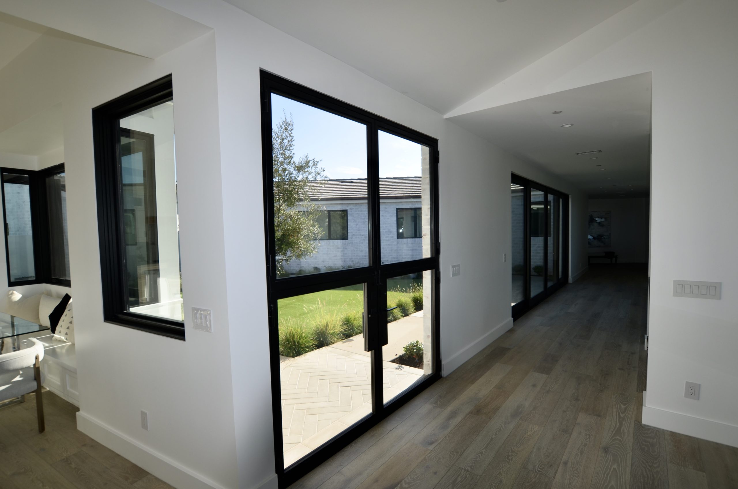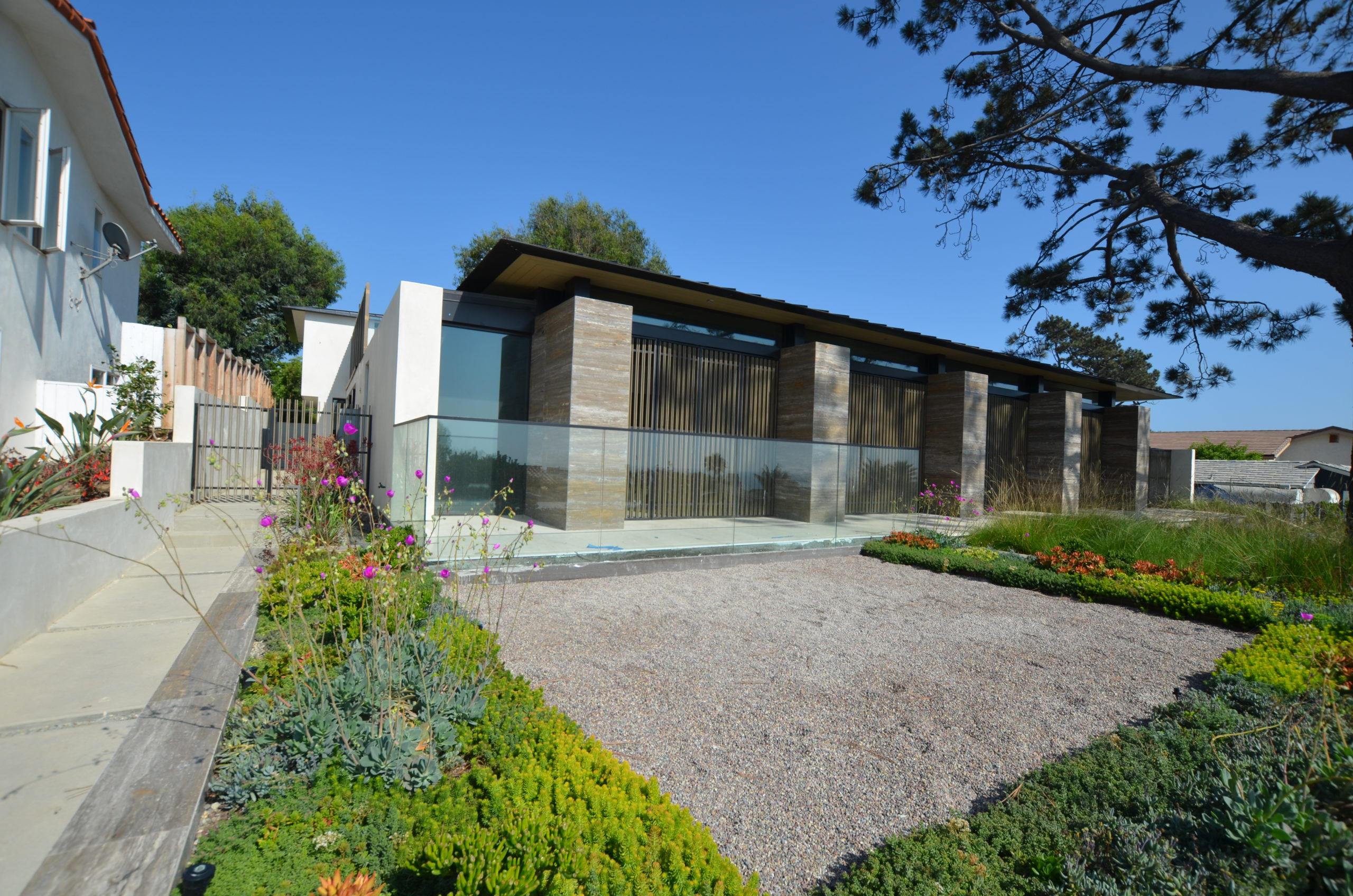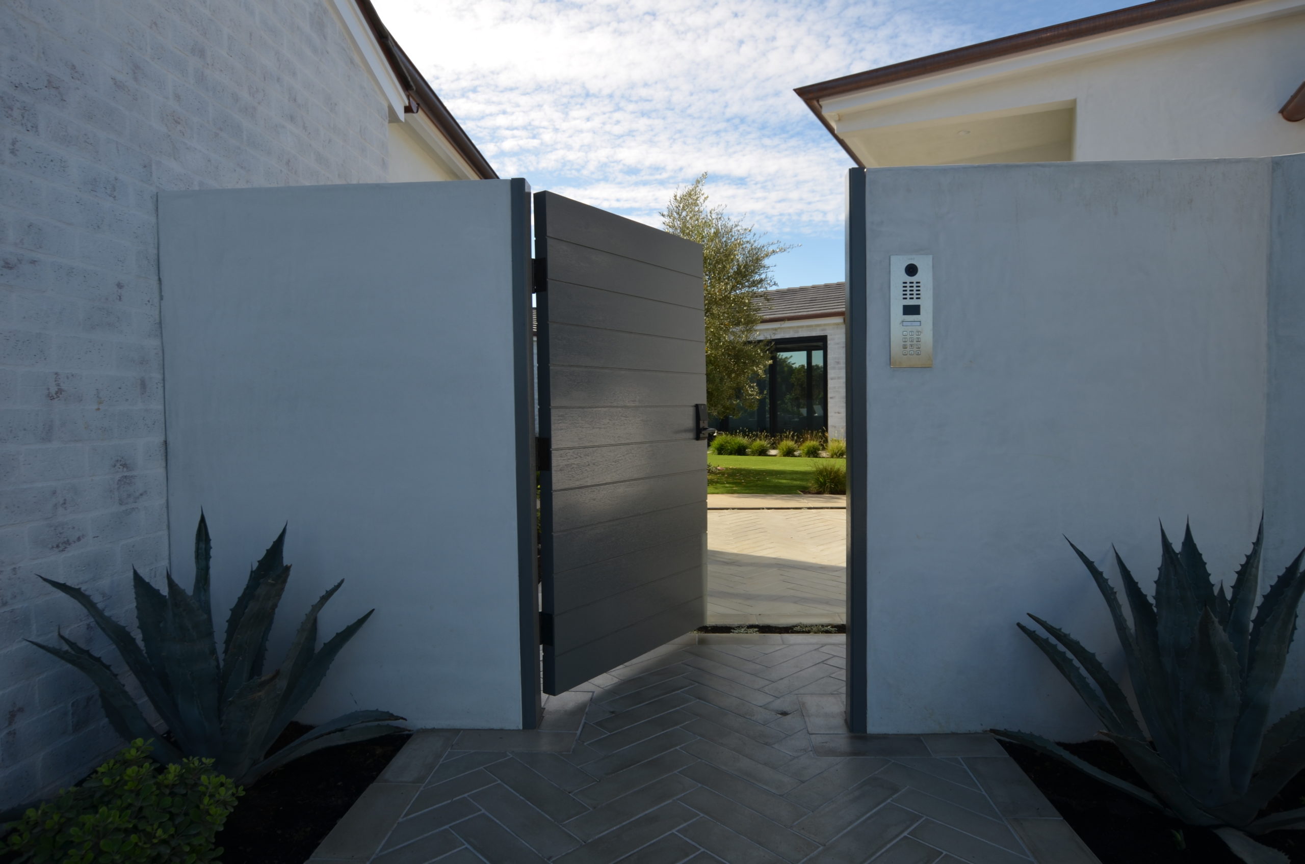 Flush Pivot Door with Integrated Steel Pull Handle and Sidelite.