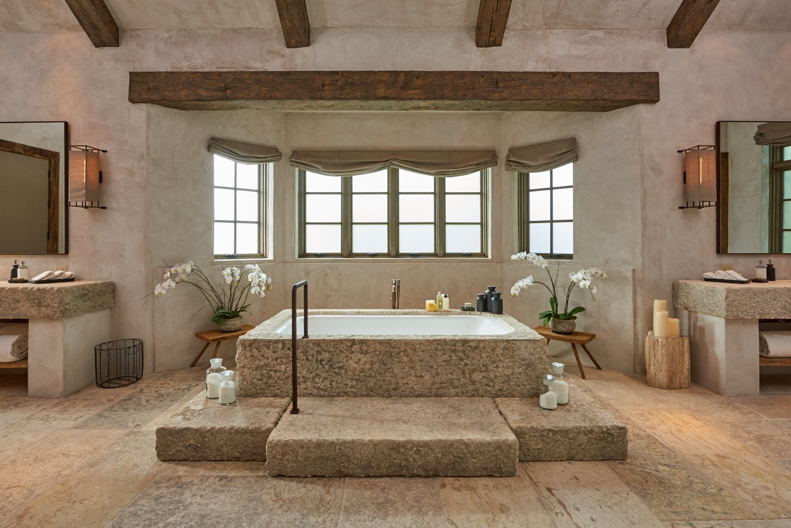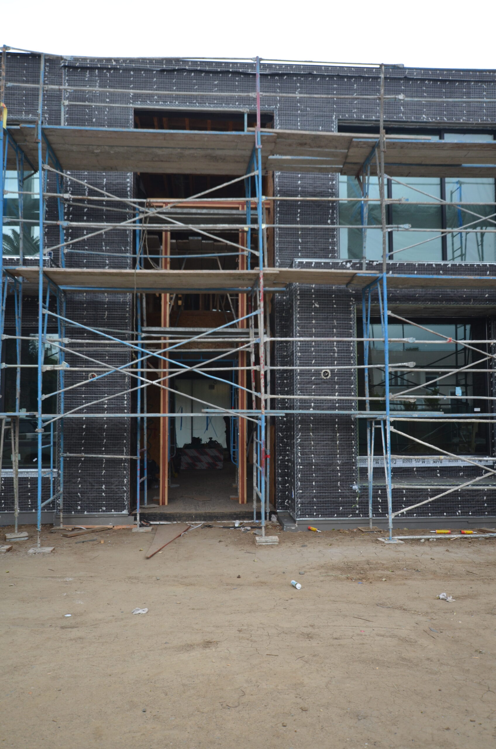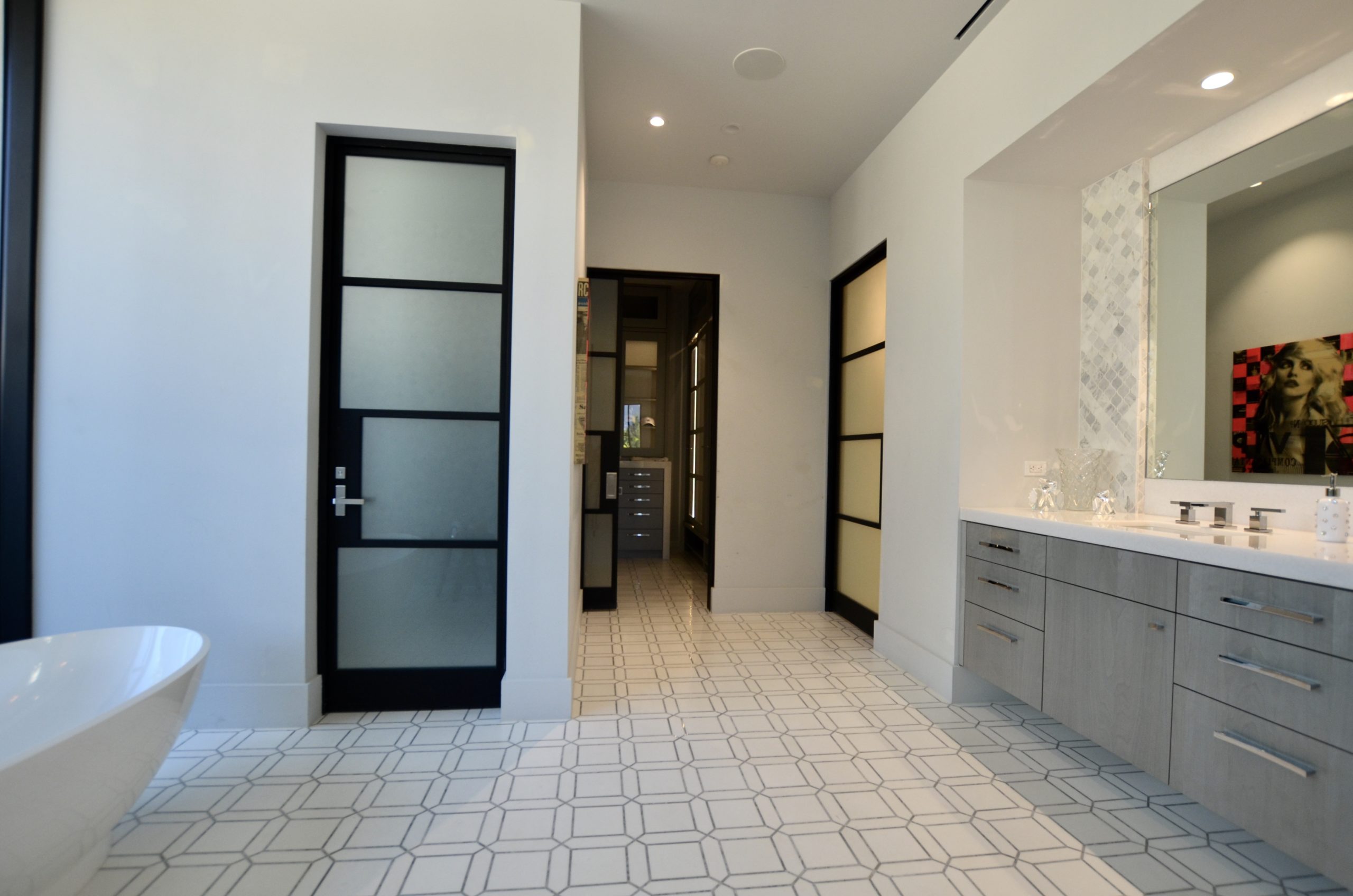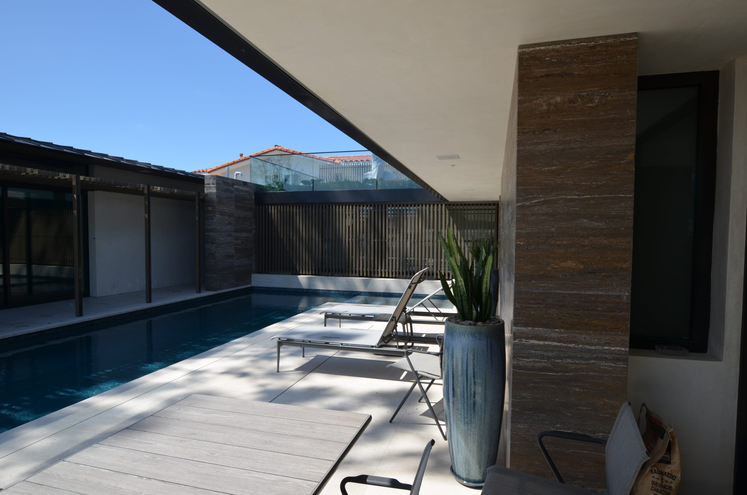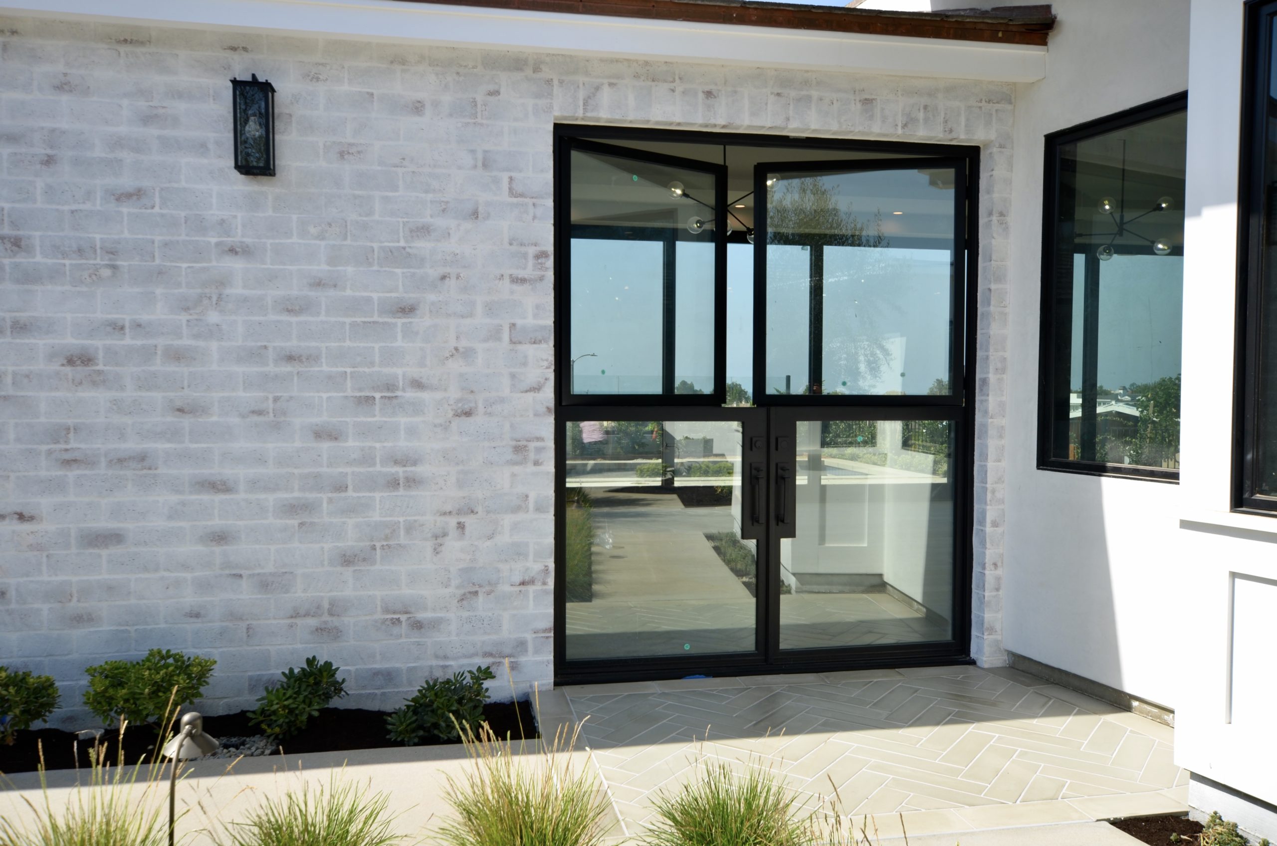 Flush Pivot Entry Door with Cladded Columns and Fixed Transom.
